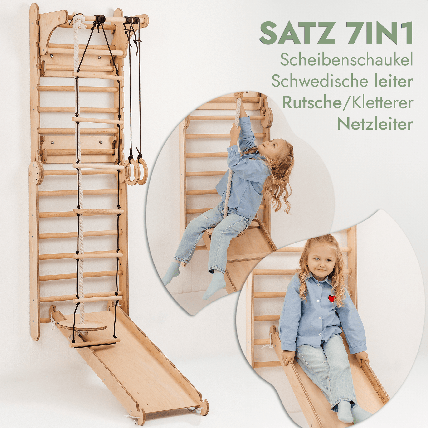 Das vielseitige Design ermöglicht es, die Wand mühelos in ein Pikler-Dreieck mit Rutsche zu verwandeln und bietet damit noch mehr Möglichkeiten für Bewegung und Spiel. Das Set enthält außerdem drei verschiedene Schaukeln, die für Abwechslung und Spaß sorgen. Die Goodevas Sprossenwand ist mehr als nur ein Spielgerät – sie steht für Entwicklung, Sicherheit und langlebige Qualität.