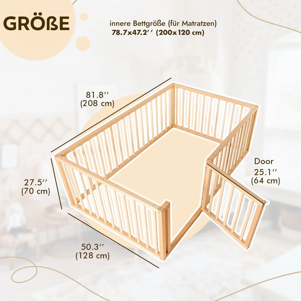 Das Montessori Bodenbett (200x120 cm / 190x90сm) eignet sich hervorragend für Kinder ab 1 Jahr. Sein Design als großer Laufstall mit Bodenrahmen macht es nicht nur zu einem bequemen Schlafplatz, sondern auch zu einem praktischen Spielbereich. Ihre Kinder fühlen sich geschützt und entwickeln aufgrund der Montessori-Prinzipien auch ihre eigene Unabhängigkeit und Motorik. Das Bett besteht aus Holz und kann leicht zusammengebaut werden. Es verfügt über eine robuste Konstruktion und ein Minimum an Schrauben, was Ihrem Kind zusätzliche Sicherheit bietet.