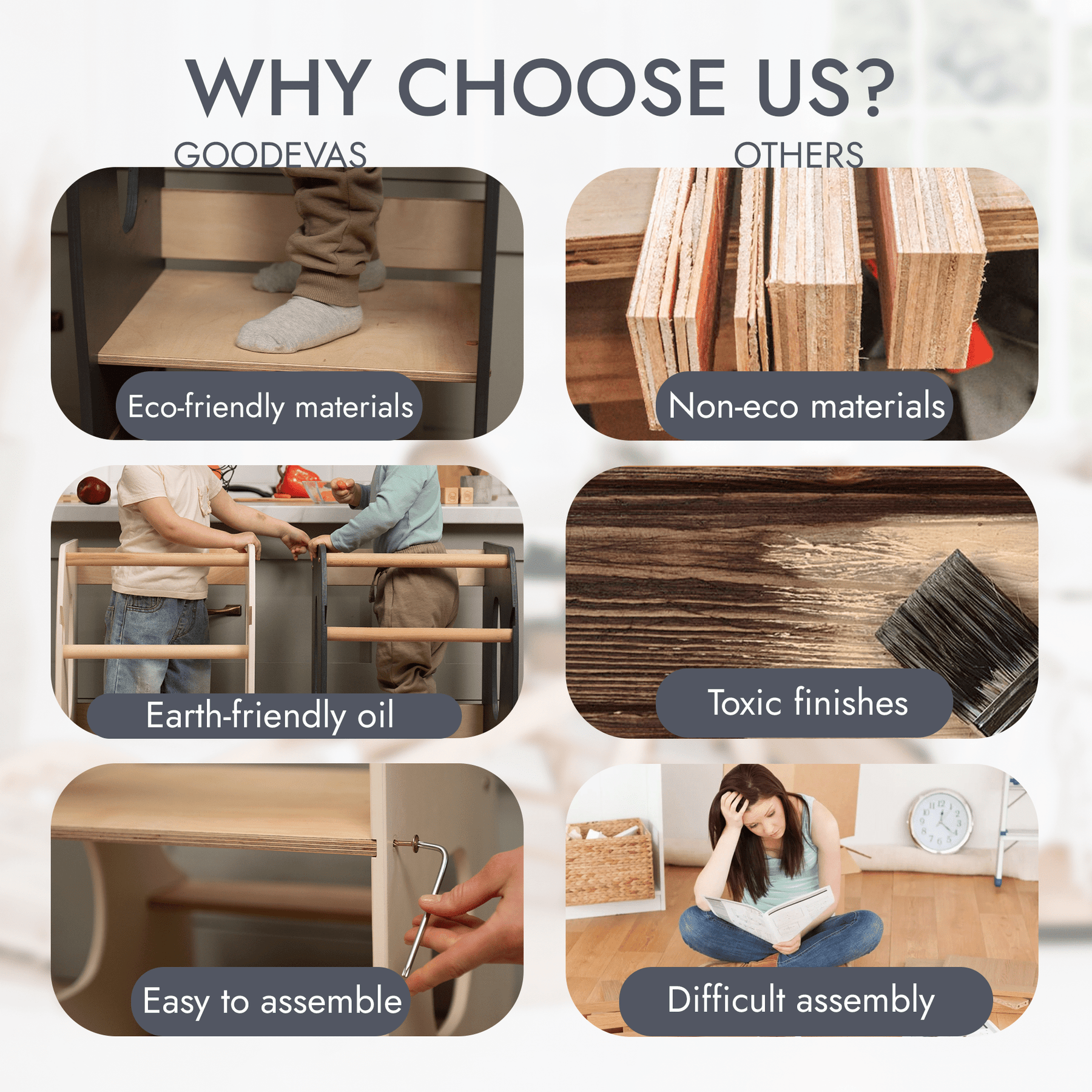 Lassen Sie Ihr Kleines mit Zuversicht entdecken, lernen und wachsen! Vom Rühren und Kneten des Teigs über Schneiden, Schneiden, Eingießen bis hin zum Zähneputzen oder Abwaschen – alltägliche Aufgaben werden mit der Unterstützung unseres klappbaren Lernturms für Kleinkinder zu einer spaßigen und lehrreichen Erfahrung.